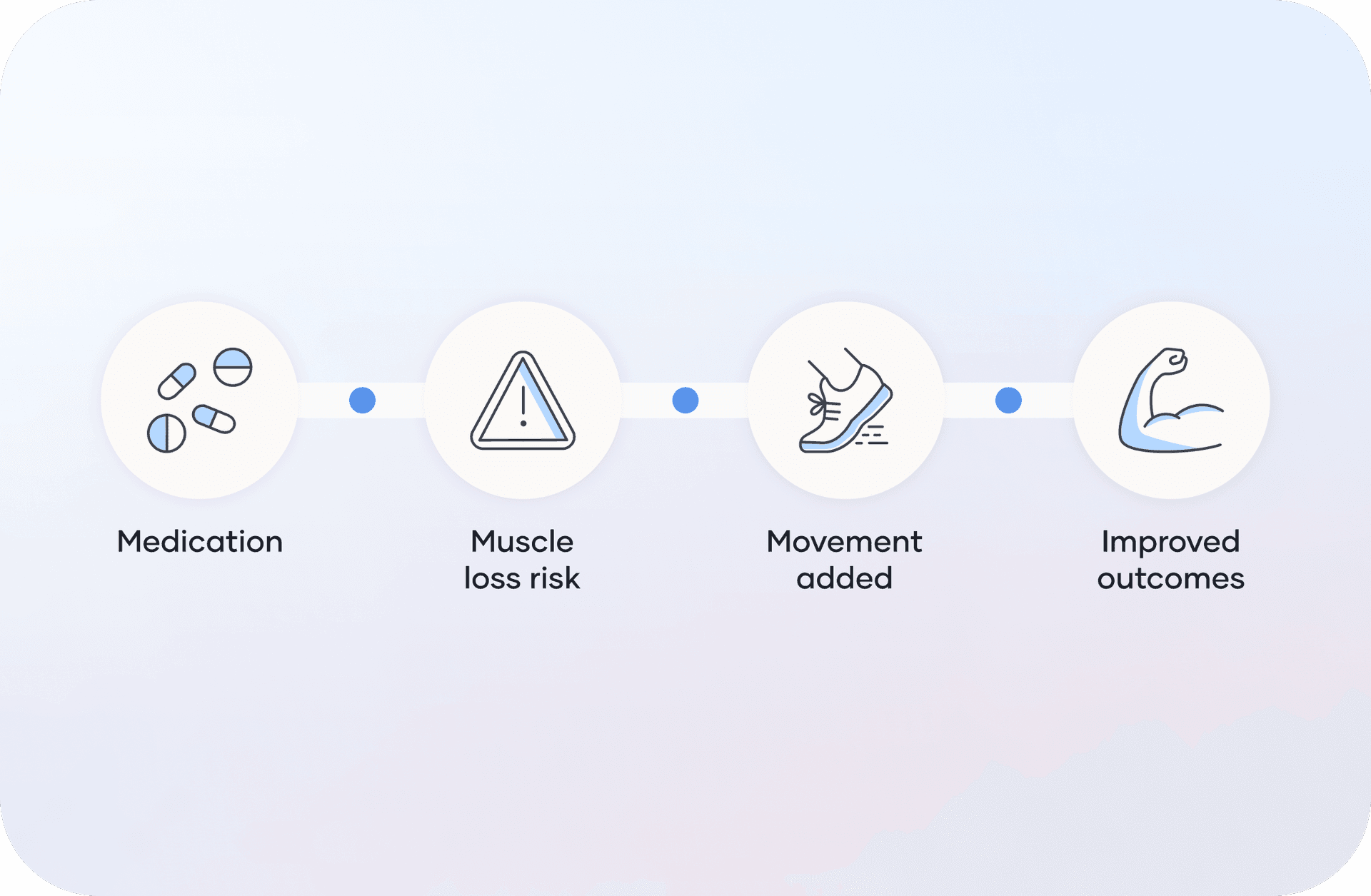 Many patients begin GLP-1 medication from a low-activity baseline. Without structured movement before and during treatment, they are more likely to lose lean muscle and regain fat2.