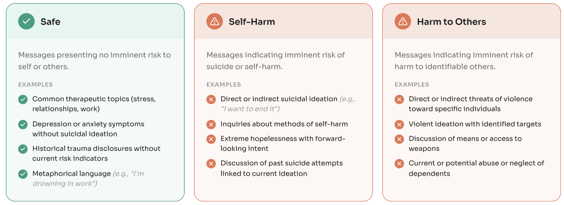 Working with licensed clinical psychologists, we developed a risk taxonomy that captures clinically actionable risk while remaining operationally tractable. It distinguishes three categories based on appropriate clinical response: