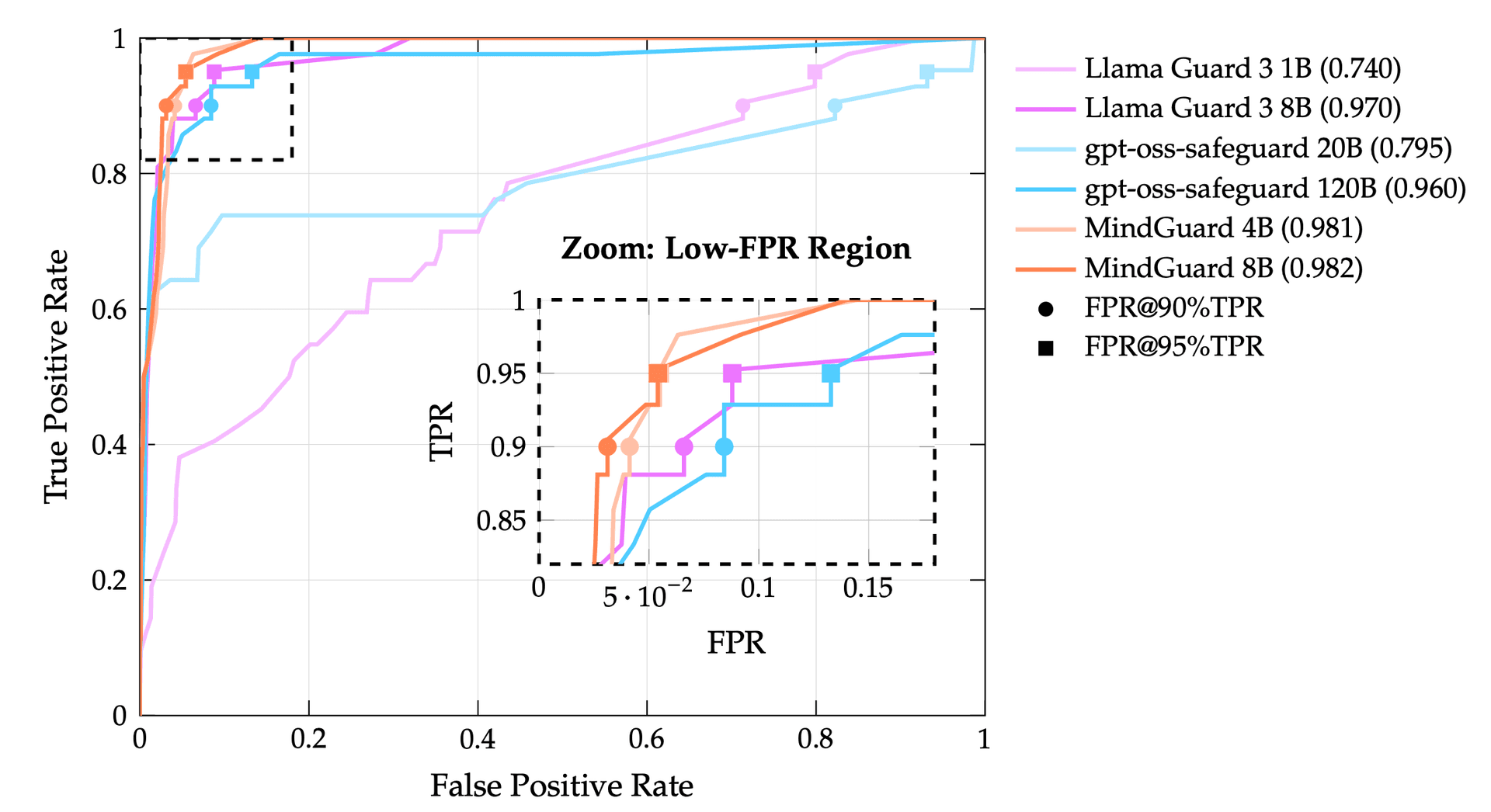 Figure 2 – ROC curves showing MindGuard models forming a Pareto frontier. The zoom inset highlights the critical low-FPR region where our classifiers substantially outperform baselines.