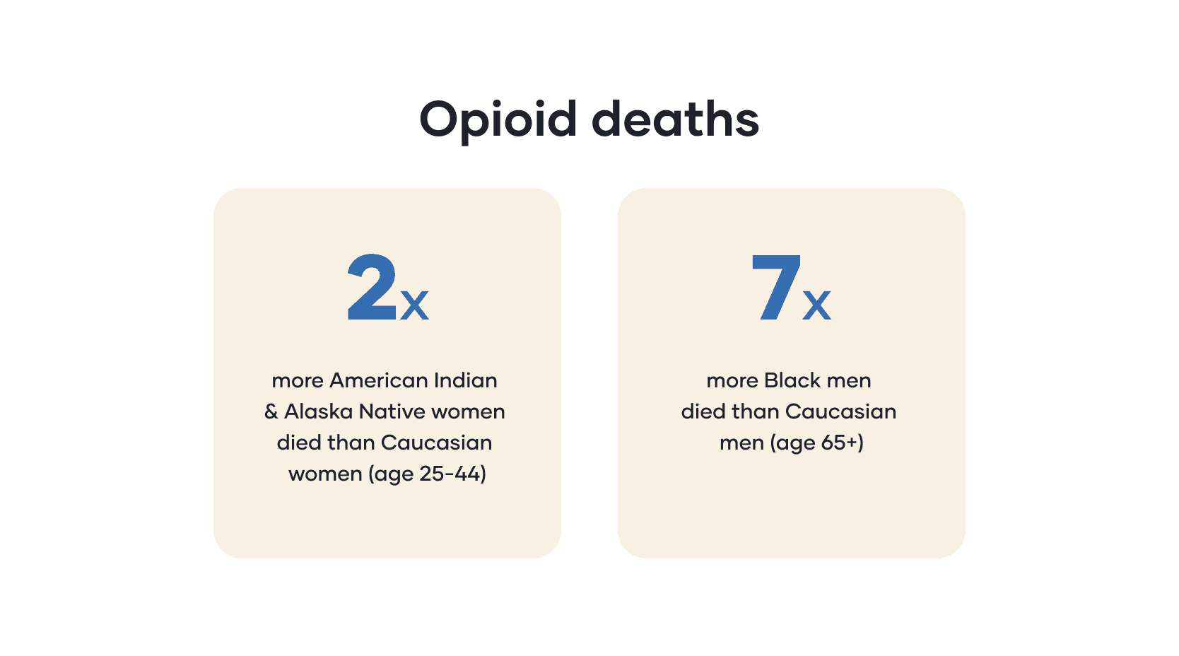 Within the opioid crisis lies another glaring problem. A 2022 report released by the Centers for Disease Control and Prevention illustrates how, in the wake of COVID-19, opioid-related deaths for minority groups have reached staggering heights. Between 2019 and 2020, overdose deaths increased 22% for people who are white, Asian and Pacific Islander, or Hispanic. But deaths hiked by 44% among Black individuals and 39% among American Indian and Alaska Native people.