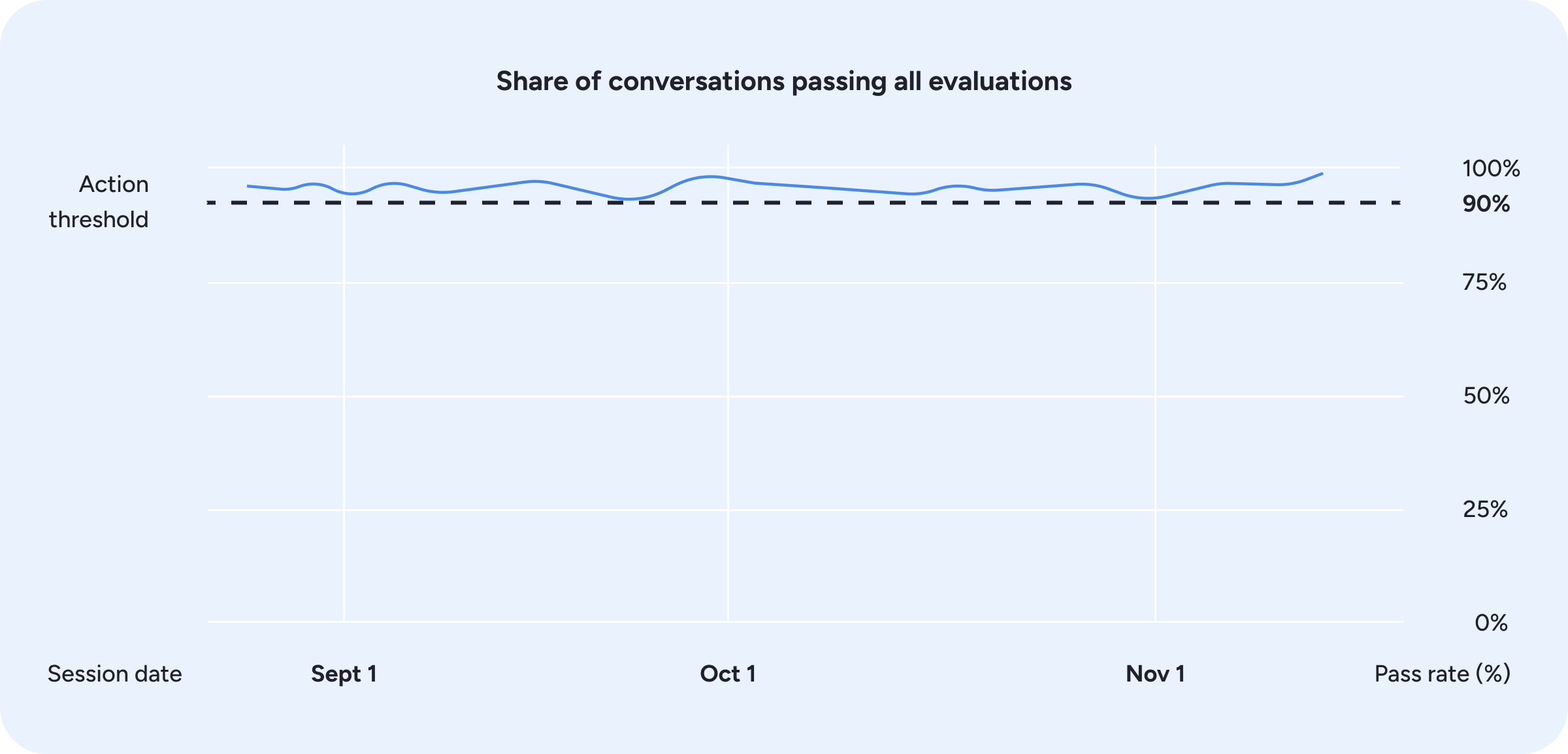 Figure 12: Online evaluation pass rates over time, with automated monitoring triggering action when performance approaches the threshold.