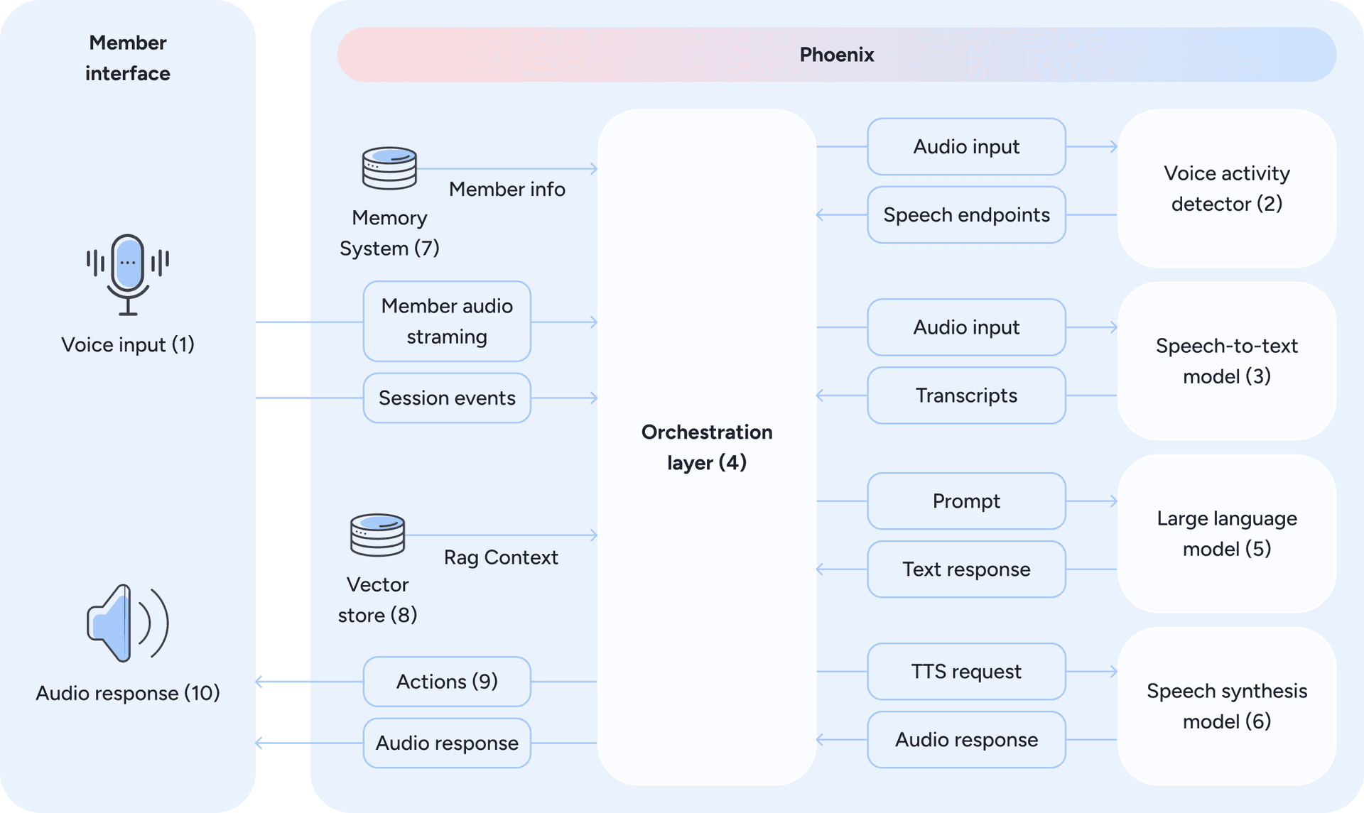Figure 2: Phoenix’s voice-first architecture - from member speech to contextualized, real-time voice responses, mediated by an orchestration layer.