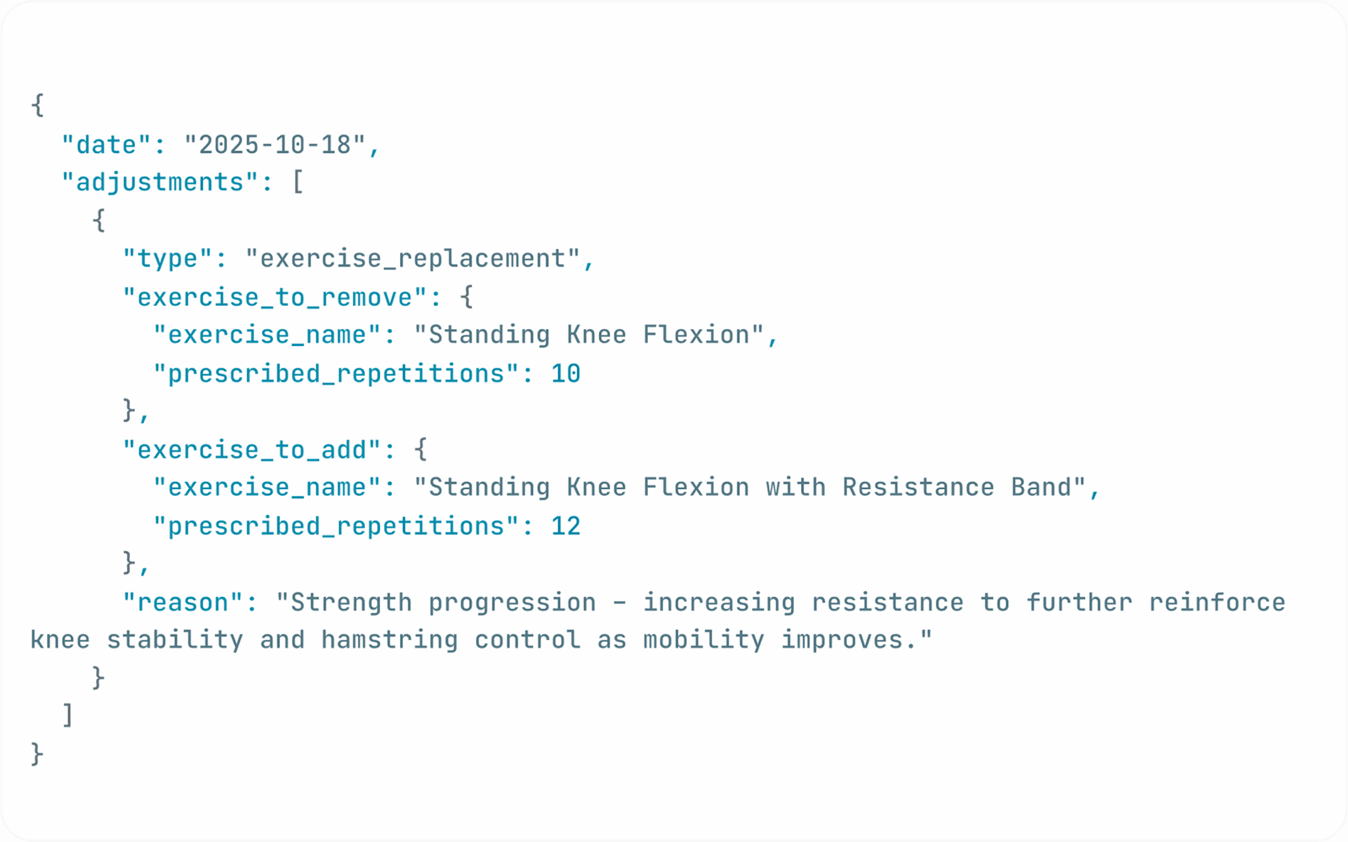 The example below (Figures 6, 7, and 8) illustrates how clinical notes, interactions with the specialist, and program adjustments are transformed into refined memory that Phoenix uses in future sessions. In this case, the member reported mild knee stiffness, the specialist shared an educational resource, and one exercise was updated. The raw inputs, shown as they arrive in the system, highlight exactly why refinement matters: a model operating in real time cannot reason effectively over verbose, heterogeneous data in different formats and structures. The memory summary captures what is actually relevant, providing Phoenix with structured signals that can be surfaced appropriately in subsequent interactions.