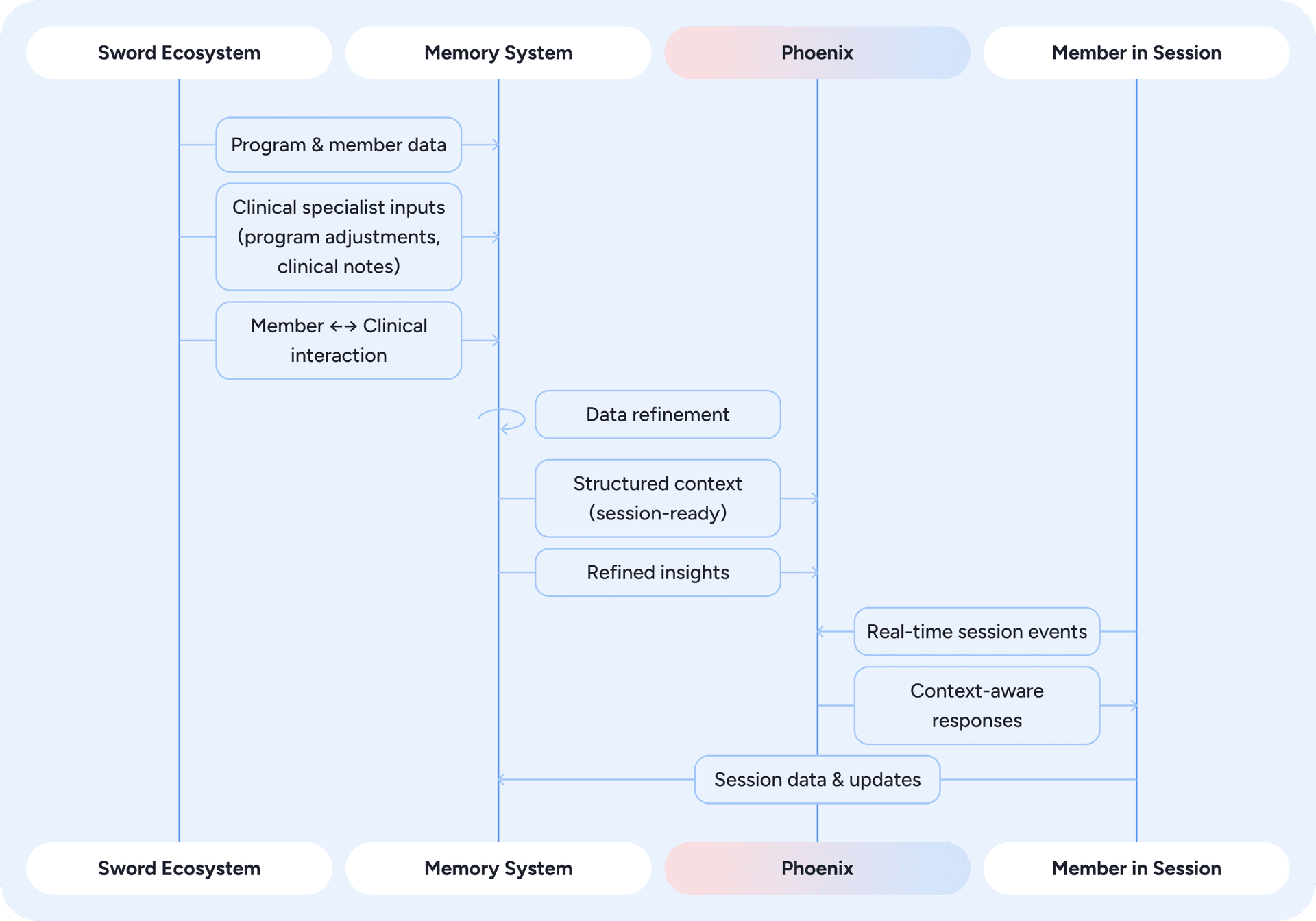 At the start of each session, Phoenix retrieves structured data that reflects the member's current context. This includes onboarding details, summaries of prior sessions, and program information that defines their treatment path. Phoenix also accesses refined insights generated from events across the Sword ecosystem. These events are captured in real time and processed asynchronously through an event-driven pipeline. Within the memory system, raw signals such as past conversations, clinician notes, and program adjustments are condensed by LLMs into concise, standardized insights stored in natural-language form.