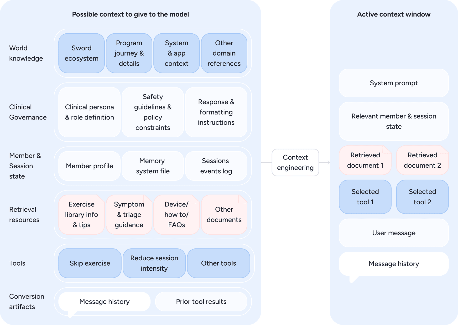 Safety, however, starts before the model even responds, through deliberate context engineering. The diagram below (Figure 9) illustrates how Phoenix assembles this context by drawing from clinical data, member information, system inputs, and available tools, selecting only what is relevant for the current turn. This forms the active context window: a carefully constructed snapshot designed to keep each model invocation grounded in the correct blend of clinical guidance, member state, and safety constraints.