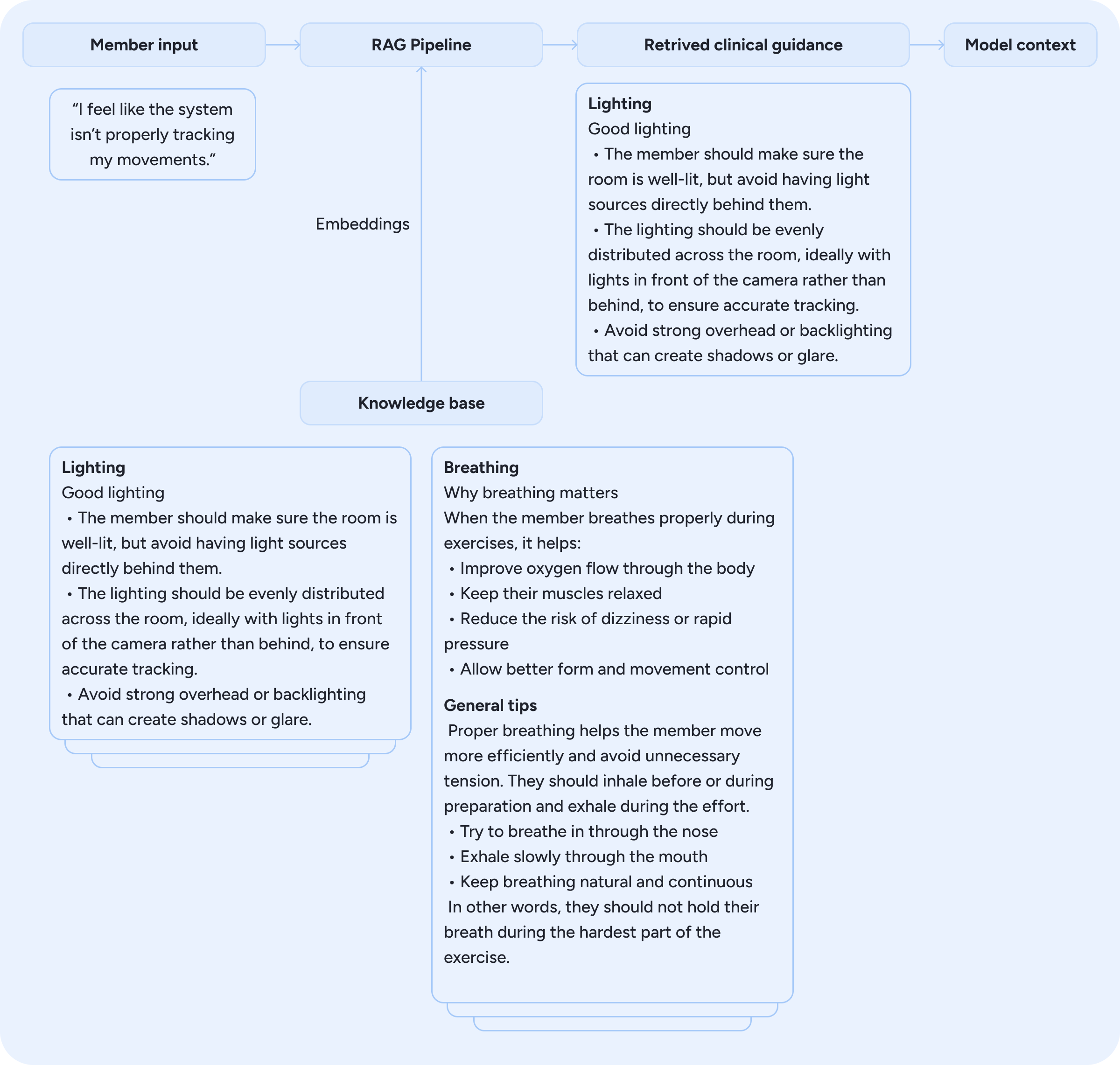 Phoenix is grounded in Sword’s proprietary clinical knowledge bases. A Retrieval-Augmented Generation (RAG) pipeline acts as a dynamic context builder, enriching the model’s context by surfacing evidence-based information relevant to each moment, such as guidance for a particular exercise or tailored suggestions when a member reports a specific symptom or behaviour, as illustrated in Figure 10. The system combines hybrid search with dense embeddings to retrieve the most relevant content, ensuring that each response is supported by accurate, up-to-date knowledge. This approach complements the model’s context and enables Phoenix to reason within clinically verified information.