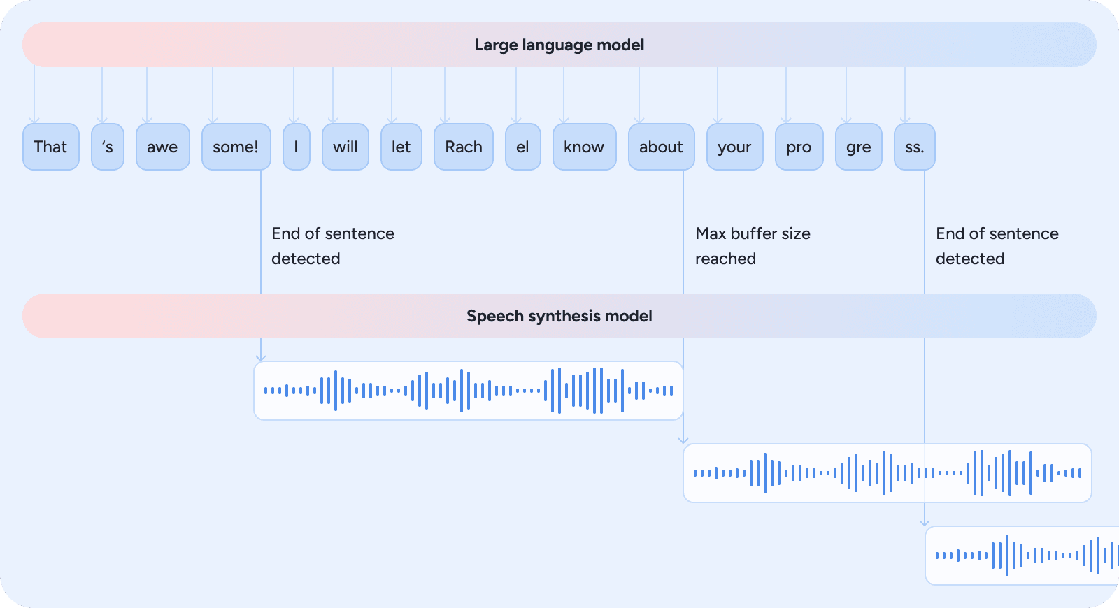Figure 4: The orchestration layer triggers speech synthesis as soon as heuristics indicate sufficient context for coherent audio, reducing latency while keeping the interaction fluid.